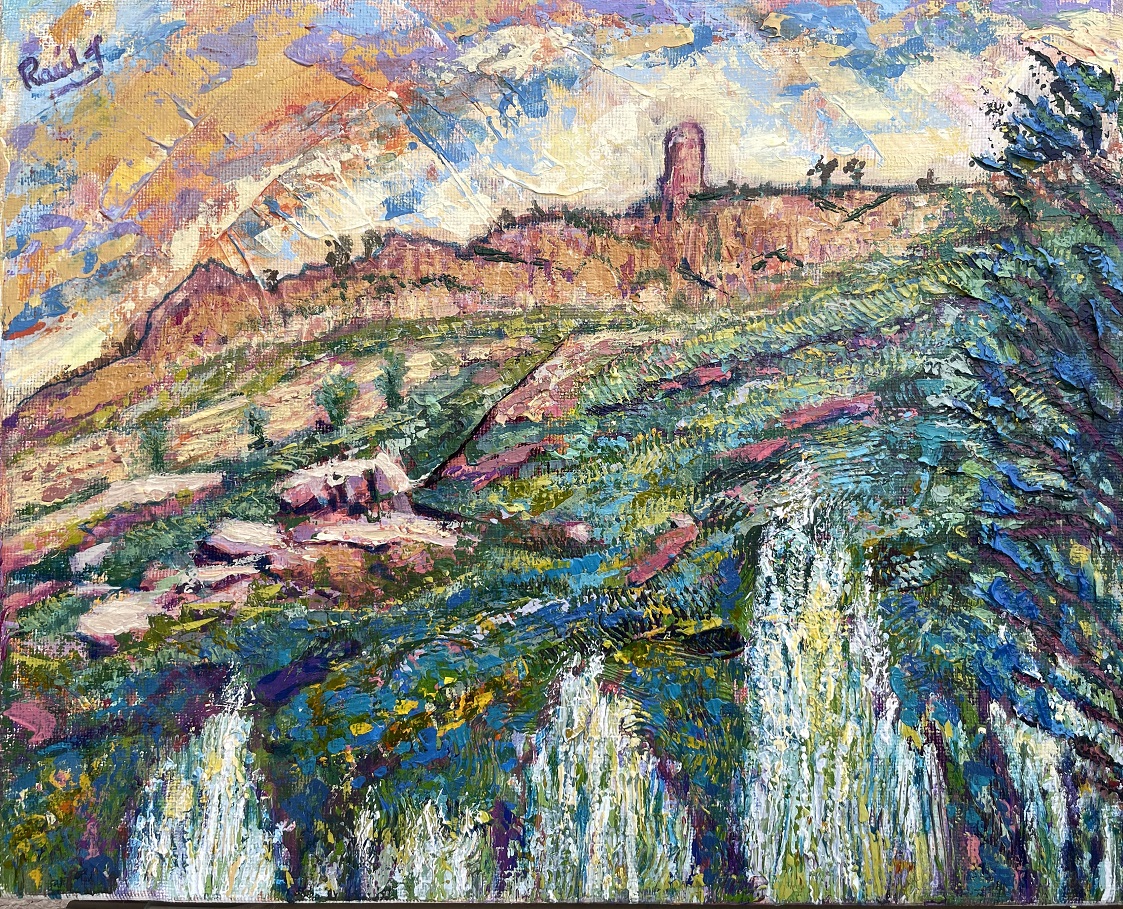 Esta obra captura la majestuosidad de las torres del castillo de Montornés en Benicàssim, un emblema histórico y natural de nuestra tierra. Con una explosión de colores vibrantes y pinceladas dinámicas, se destaca el contraste entre los tonos cálidos del cielo y los verdes profundos del paisaje.